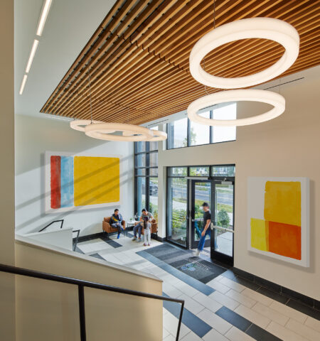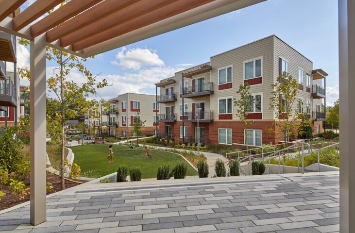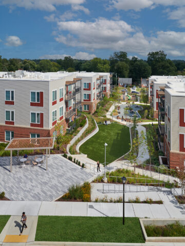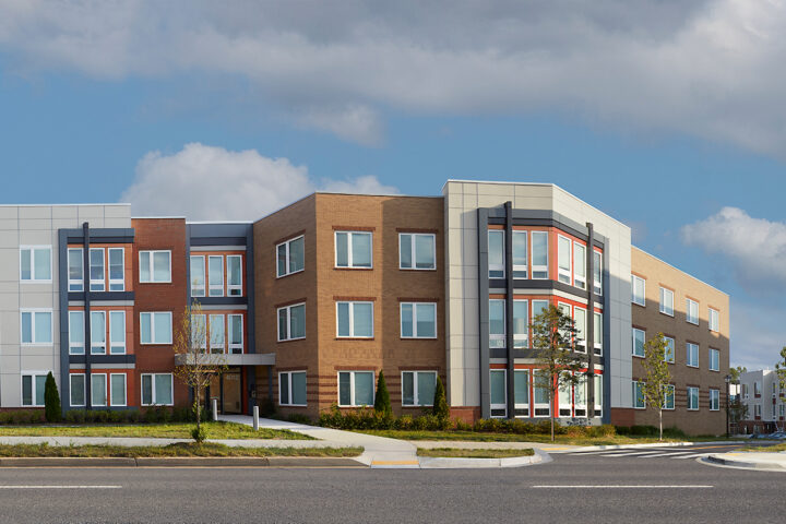 Located in Silver Spring, Maryland, an existing underutilized county-owned civic center and auditorium are re-envisioned as Allium Place as part of the Veirs Mill Corridor Master Plan that better connects communities to improved transportation and urban infrastructure. The design further capitalizes on its prominent location at the intersection of Randolph Road and Veirs Mill Road – the commercial core between Rockville and Wheaton – by adding density, diverse housing opportunities, affordable housing, and community spaces. A public-private partnership with Montgomery County (contributing the land), AHC and Habitat for Humanity overcame constrained financial parameters and leveraged partnerships and efficient design to maximize cost-effectiveness without compromising quality. The design team and community stakeholders developed and studied multiple schemes aligned with Montgomery County’s vision for enhancing the Veirs Mill Corridor for the community per the master plan.