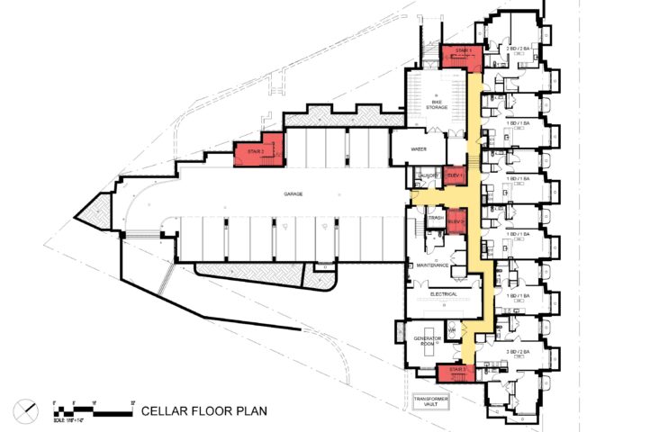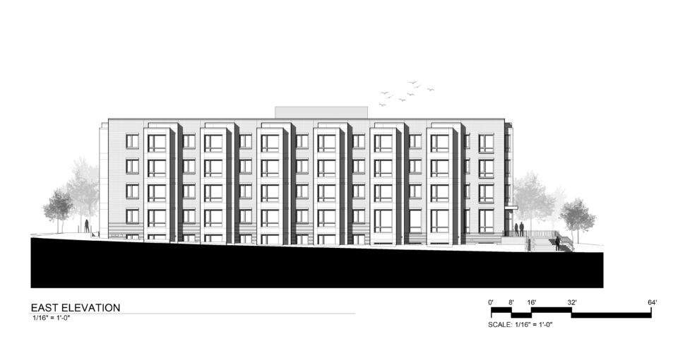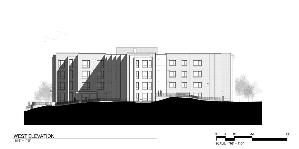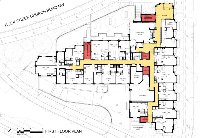 At the North East corner of the site at the intersection of Hawaii Ave and Rock Creek Church Road, a four-story bay with ground level glass entry doors marks the main entry to the building. Abutting the main entry is a four-story glazed stair tower that encourages stair use and creates a glowing nighttime beacon. Rock Creek Church Road, which runs diagonally along the northwest edge of the site and was designed to function as a “Greenway” or “Parkway’ connecting the east and west segments of the city. The leg of “T” defines a large open space along this edge, reinforcing the intended “Parkway” character of the road and adjacent Rock Creek Cemetery. The building façade steps along the face, defining a landscaped and contain an outdoor amenity terrace and play area for residents.