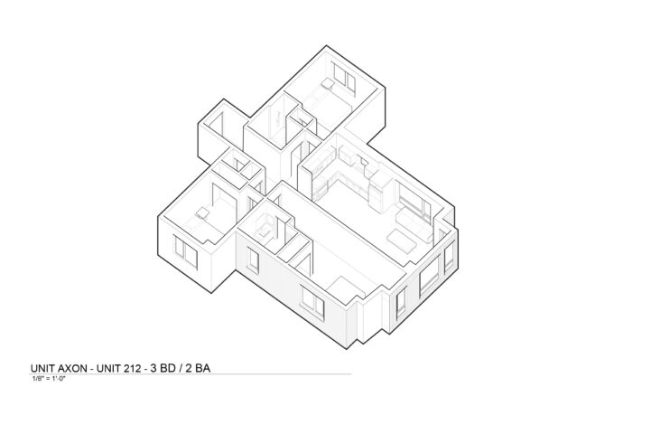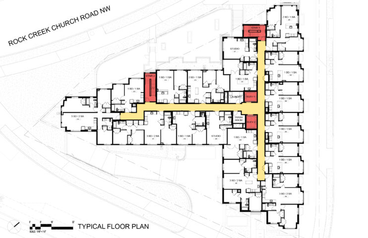 Designed in response to its unique triangular site, the “T” shaped masonry building address the primary urban edge along Hawaii Avenue, and a natural park-like setting along Rock Creek Church Road and Allison Street. A slender masonry mass forms a bar as the head of the “T”, creating a strong, urban street wall that relates to the existing red brick townhomes across Hawaii Avenue. The bar is modulated by a series of six evenly spaced bays that create a rhythm evocative of historic DC townhomes.